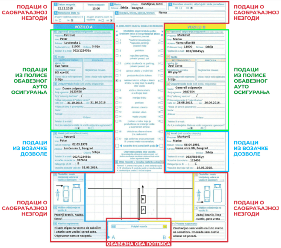 - Evropski izveštaj je jasno definisan i treba uneti sve tražene podatke. OBRAZAC JE VAŽEĆI UZ POTPIS OBA UČESNIKA NEZGODE.